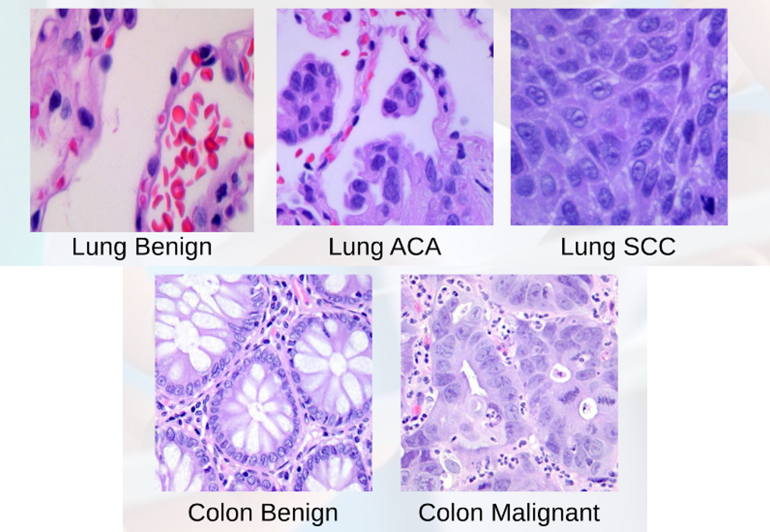 ML pipeline which differentiates between 5 classes of cancer images: first between colon and lung cell images, then between malignant and benign cells within these categories, and then finally into specific types of malignant cells.
