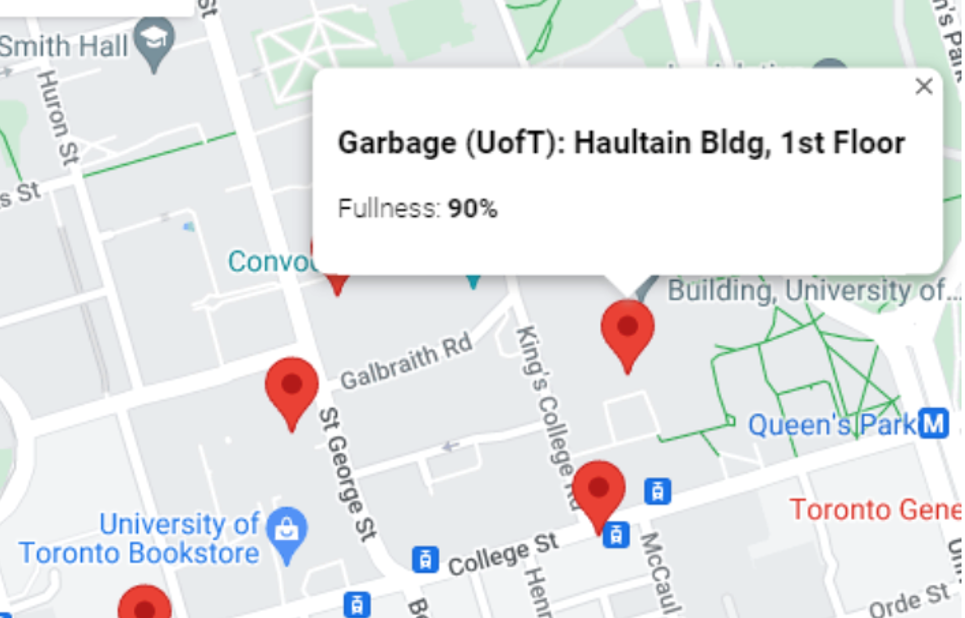 Internet-of-Things smart garbage bin network developed to reduce littering, improve maintenance, and optimize collection efficiency in Toronto, Ontario. Jan-Apr 2024.